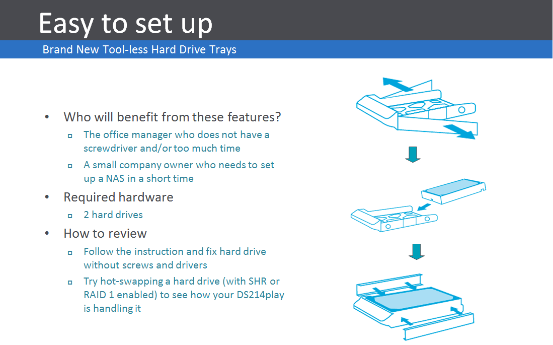 Disk o rozměru 3,5" je možné do šachty jednoduše nainstalovat bez nějakého velkého rozebírání a dokonce i bez jakýchkoliv nástrojů, čímž se úložiště více přibližuje širší veřejnosti. Stačí sundat přední kryt a vysunout rámeček na disk. Ten má z vnitřní strany výčnělky, které zapadnou do otvorů na disku pro uchycení šrouby.