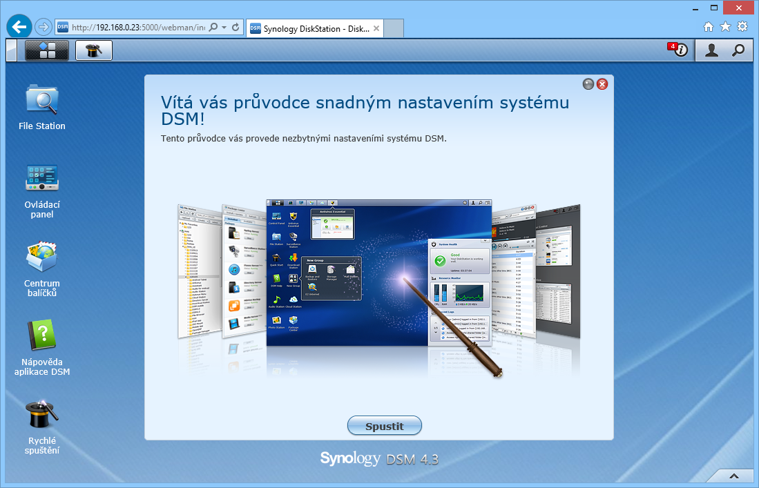 Zprovoznění zařízení je dosti jednoduché. Společnosti Synology se během posledních let podařilo hodně přizpůsobit sektoru spotřební elektroniky, aniž by její zařízení ztrácela na funkčnosti. Instalace disků, která dříve byla pro spotřebitele často problémem, se obejde bez nářadí. Stačí obrázkový návod. Operační systém Synology DSM s českou lokalizací je velmi intuitivní.