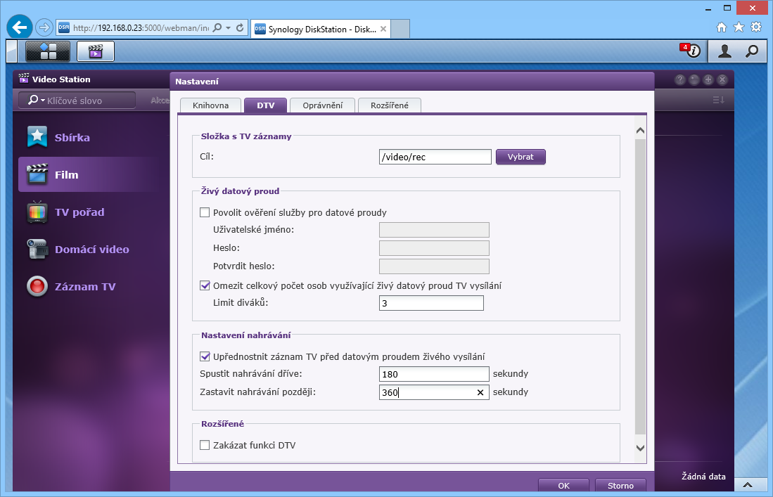 Podporováno je také streamování televizního vysílání v reálném čase, které pak lze sledovat například na displeji tabletu nebo monitoru počítače, aniž by samotné zařízení muselo mít vlastní televizní kartu (tuner). Stačí připojení k síti. Synology DS214 Play opět přizpůsobí video potřebám koncového zařízení. Bohužel pro test nebyl k dispozici kompatibilní TV tuner.