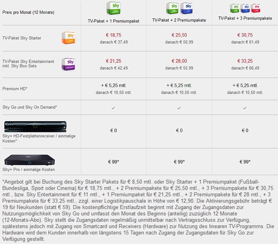 Kompletní přehled cen služeb a balíčků Sky Deutschland (klikněte pro zvětšení).