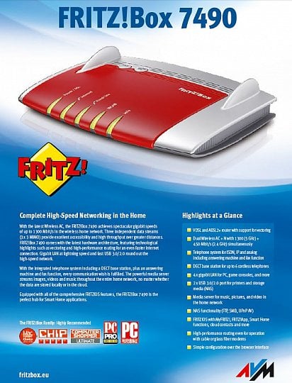 Fritz!Box 7490 je kompletní domácí ústředna a je k pronájmu za 5 € měsíčně.