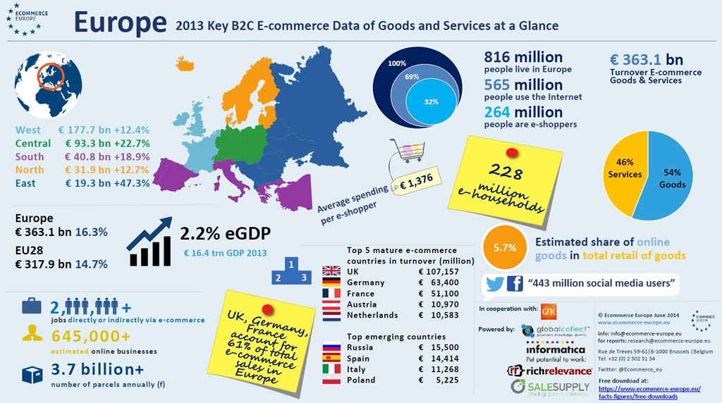 Největší meziroční nárůst zaznamenaly státy východní Evropy, mezi které Ecommerce Europe řadí i Rusko. V tomto regionu vzrostly tržby v e-komerci ve srovnání s rokem 2012 o 47,3 % na 19,3 miliardy eur (530 miliard Kč). Druhým nejrychleji rostoucím byl region střední Evropy, kterým se pro účely studie rozumí Česká republika, Polsko, Slovensko, Rakousko, Německo a Maďarsko. V těchto zemích došlo k meziročnímu nárůstu o 22,7 % na 93,3 miliard eur (2,6 bilionů Kč).