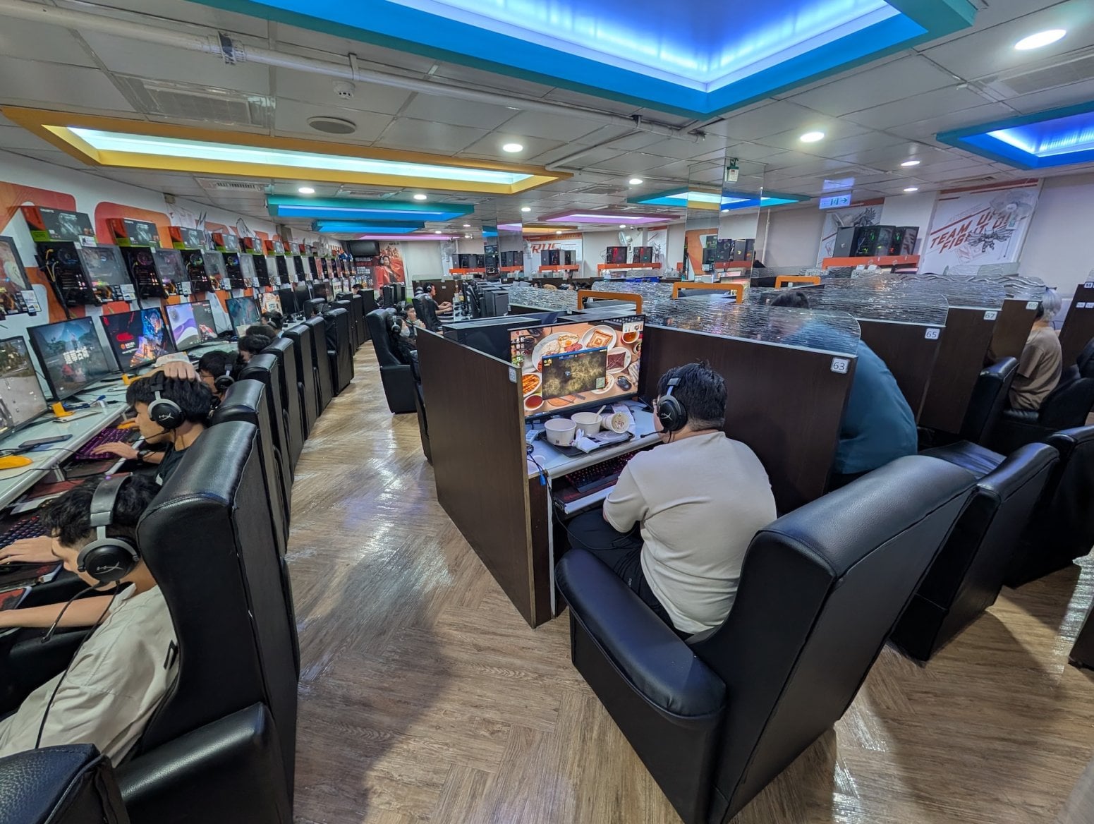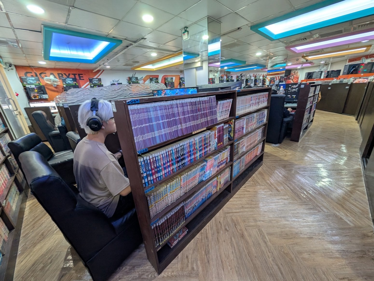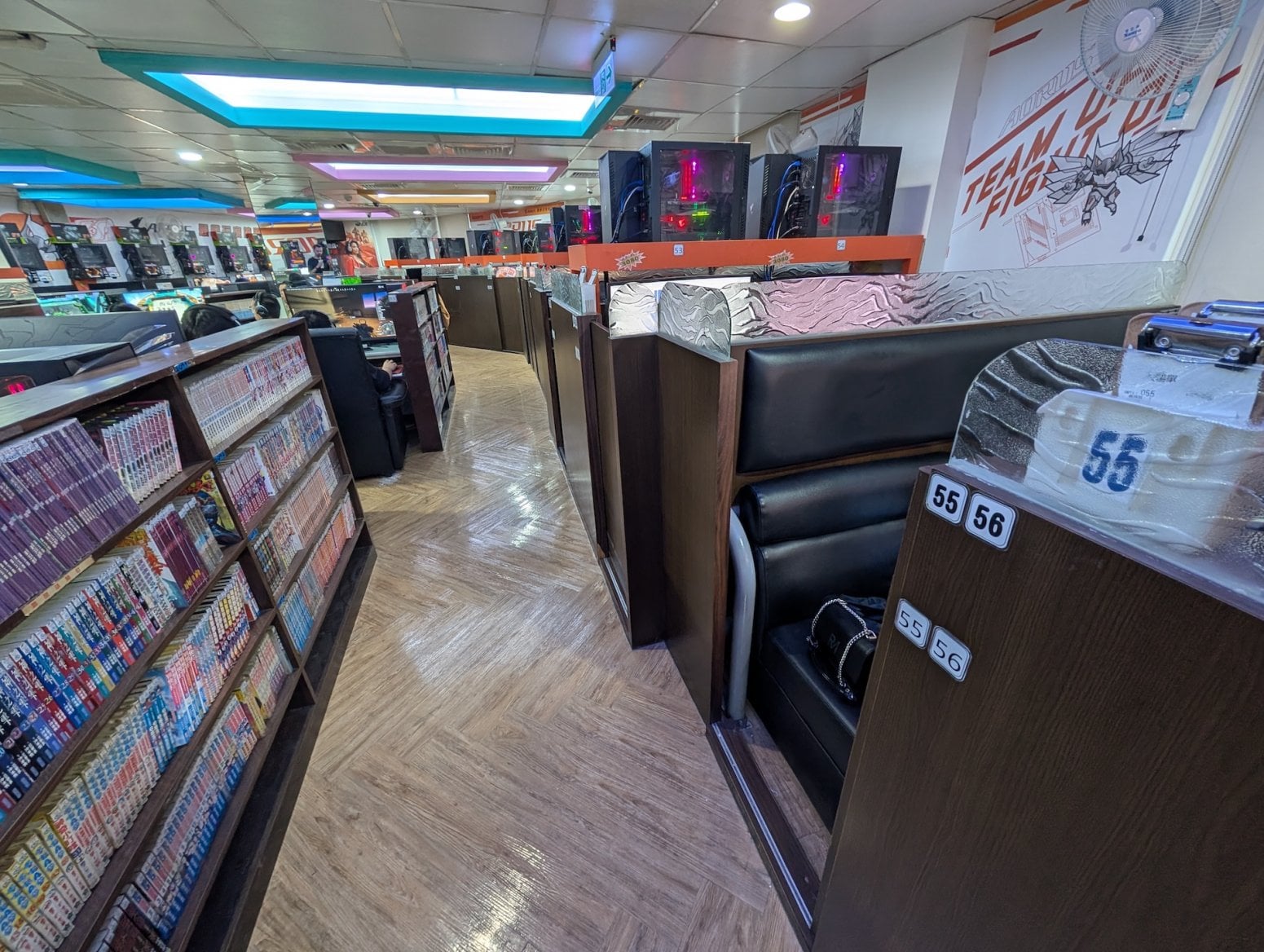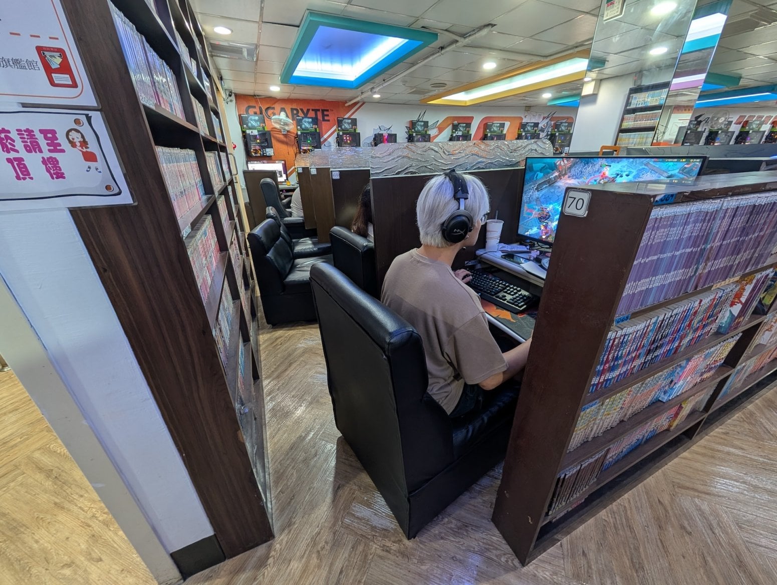 Kavárna má tři patra. To první je tradiční open space, kde jsou na sebe nalepeny kóje s počítači a konektory pro nabíječky. Nikdo si nikoho moc nevšímá, všichni jsou zabraní do hraní. Vrchní dvě patra nabízí luxusnější zážitek, a sice soukromé kóje s počítači, sezením a případně ležením. V Asii je poměrně běžné, že lidé na takovém místě přespí, případně si v soukromí přečtou nějakou mangu z obsáhlých knihoven, jenž jsou běžnou součástí heren.