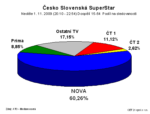 GRAF UVNITŘ Nedělní díl mezinárodní pěvecké soutěže Česko Slovenská SuperStar dosáhl v cílové skupině diváků 15–54 let podílu na publiku 60,26 % a stal se zatím divácky nejúspěšnějším dílem od začátku vysílání této série soutěže. V cílové skupině diváků starších 15 let ho sledovalo 2 065 tisíc diváků. Největší pozornost vzbudil pořad v cílové skupině mladých žen 15–24, v níž dosáhl podílu na publiku 82,17 %.