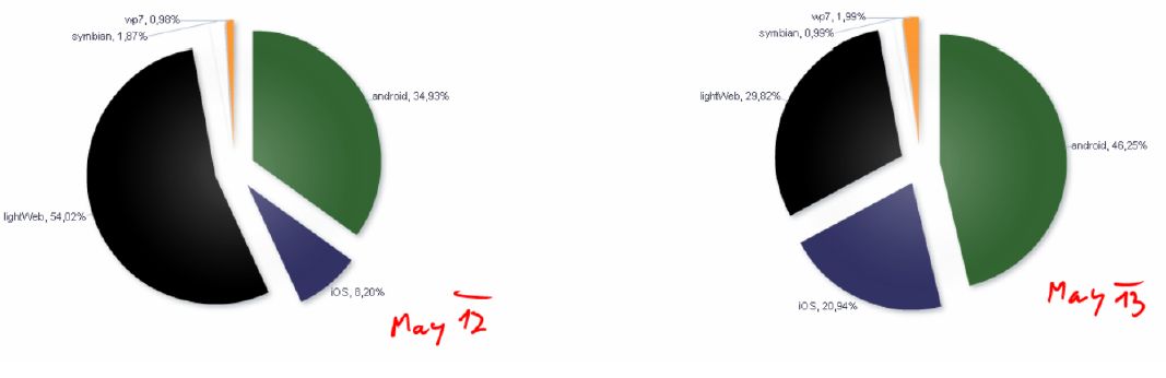 Ještě loni v květnu, co do počtu transakcí z mobilních zařízení, dominoval mobilní web. Nyní je situace jiná. Nejvíce mobilních transakcí na Aukro.cz je realizováno z platformy Android, o poznání méně tvoří přístupy přes mobilní web a pětina přístupů připadá na platformu iOS.