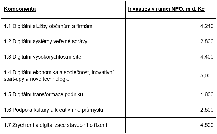 Materiál předpokládá, že Česko v rámci Národního plánu obnovy do digitalizace investuje 25,040 miliardy Kč. Oblasti, do kterých mají peníze putovat, jsou rozděleny takto:
