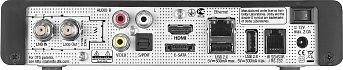 Porty od leva jsou: LNB IN, Loop Out, kompozitní výstup video/ audio L/R, SPDIF, HDMI 1,4, E-sata, Ethernet ( pouze 100Mbit LAN port), USB 2×, IR senzor a napájecí konektor pro externí napáječ 12 V/2 A.