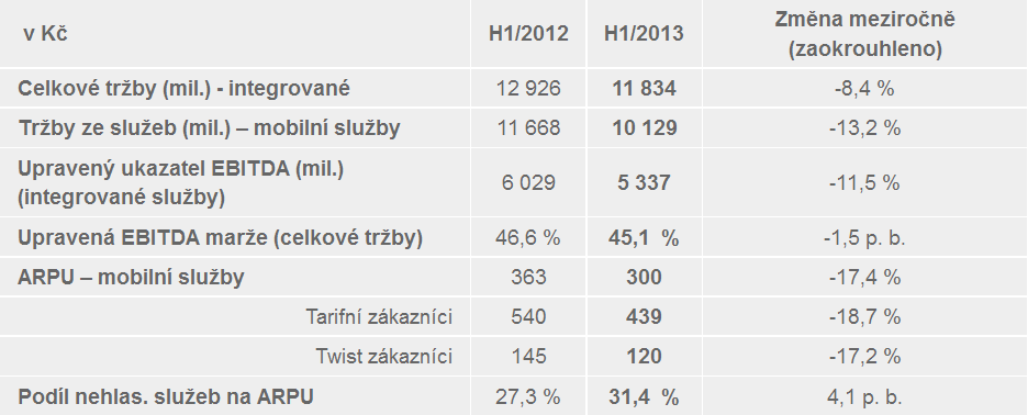 Tržby z mobilních služeb přitom společnosti meziročně poklesly o 13,2 % a celkové o 8,4 %. Hrubý provozní zisk (před daněmi, úroky, odpisy a amortizací) jí celkově poklesl o 11,5 %. Společnost tvrdí, že pokles vyrovnala zejména „interním tlakem na efektivitu“, a hrubou provozní marži tak udržela na velice pěkných 45,1 %.