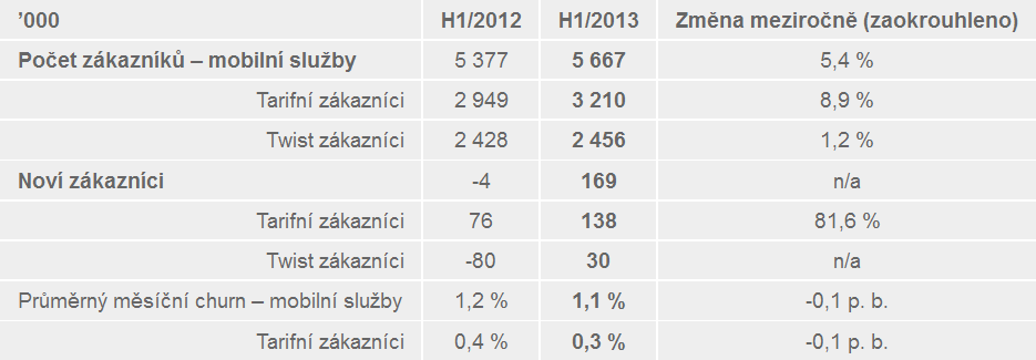 T‑Mobile hlásí, že za první pololetí celkem 169 tisíc zákazníků získal, a to přes průměrný měsíční úbytek 1,1 % zákazníků stávajících; tento ukazatel se mu podařilo drobně snížit z 1,2 % za loňské první pololetí.