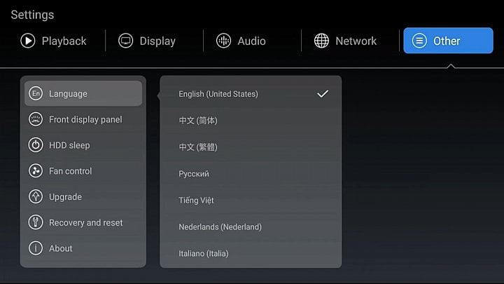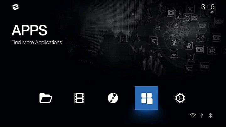 Stejně jako u ostatních HDD přehrávačů značky Zidoo i zde se o obsluhu přístroje stará uživatelské rozhraní ZIUI. Hlavní menu obsahuje pět dalších položek, ikony jsou animované.