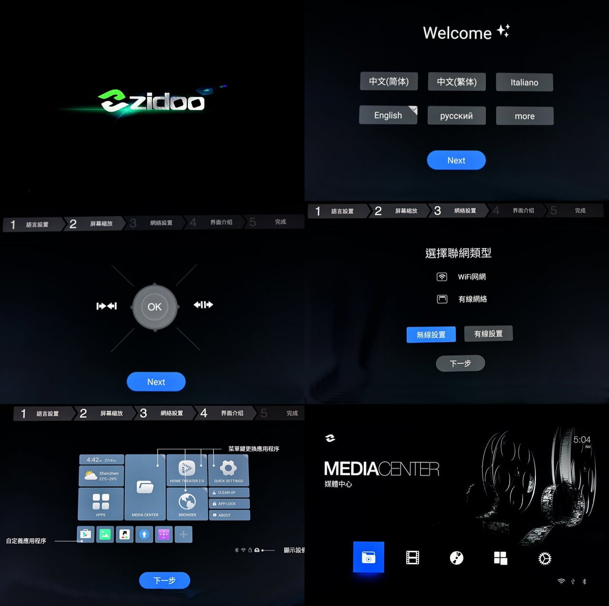 Stejně jako u ostatních HDD přehrávačů značky Zidoo i zde se o obsluhu přístroje stará uživatelské rozhraní ZIUI. Hlavní menu obsahuje pět dalších položek, ikony jsou animované.