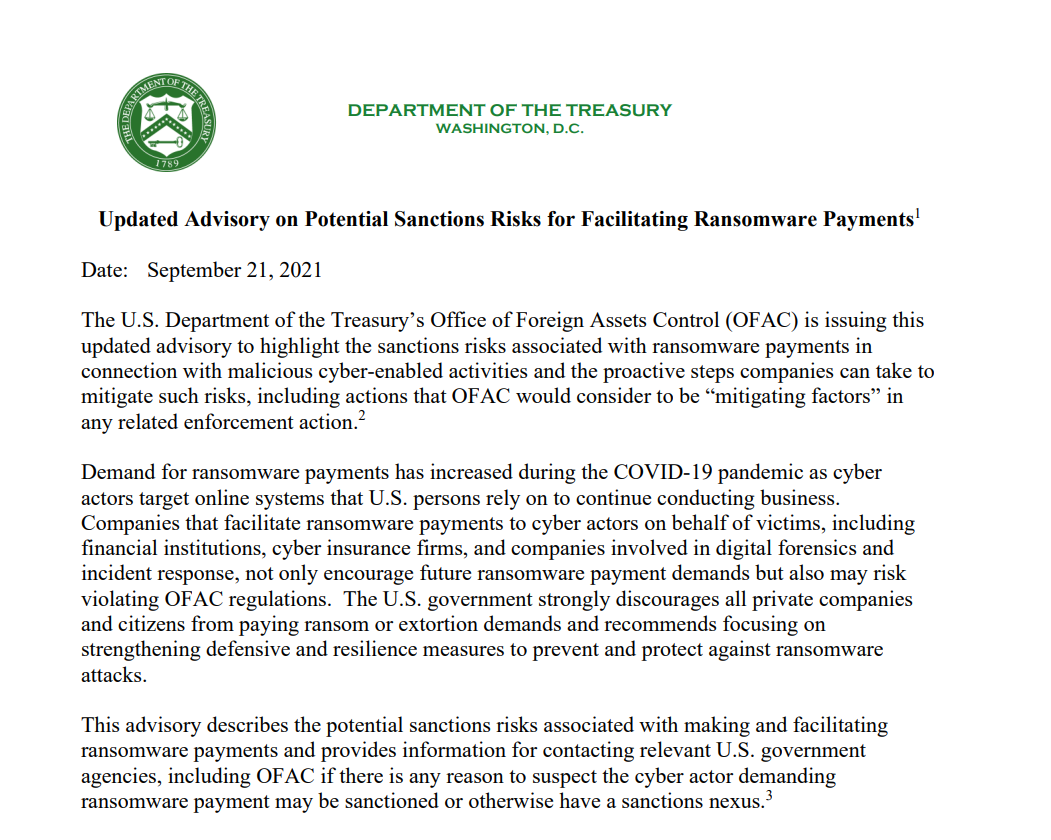 V září 2021 například kancelář ministerstva financí USA, která dohlíží na zahraniční aktiva (OFAC), vydala doporučení, které hovoří o možnosti porušení sankcí při placení ransomwarového výkupného.