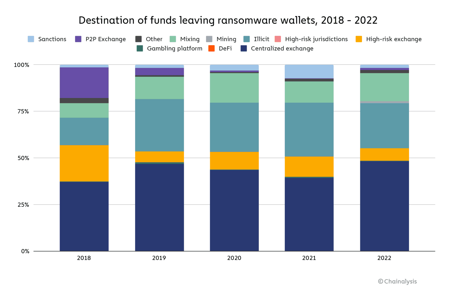 Většina útočníků na ransomware posílá vylákané prostředky na běžné centralizované burzy. Podíl prostředků mířící na běžné burzy vzrostl z 39,3 % v roce 2021 na 48,3 % v roce 2022. Může za to ale možná i fakt, že naopak podíl posílaný na rizikové burzy nepatrně klesl, a to z 10,9 % na 6,7 %. Stejně tak klesl podíl kryptoměn praných skrze darknetové služby specializující se na praní peněz z ransomwaru. Oproti tomu se nepatrně zvýšilo využívání směnáren, a to z 11,6 % na 15,0 %.