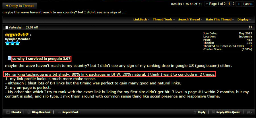 Dokládá to zejména tím, že Google porušuje pravidlo, žádné aktualizace během svátků, protože aktualizace 3.1 probíhaly i během amerického Díkůvzdání. I Bartosz Goralewicz a Dan Petrovic jsou toho názoru, že u Penguina 3 to vývojáři z Google strašlivě pokazili a Penguin 3 žádný antispamový efekt neměl, což Bartosz Goralevicz dokládá screenshotem z black hat fóra blackhatworld.com: