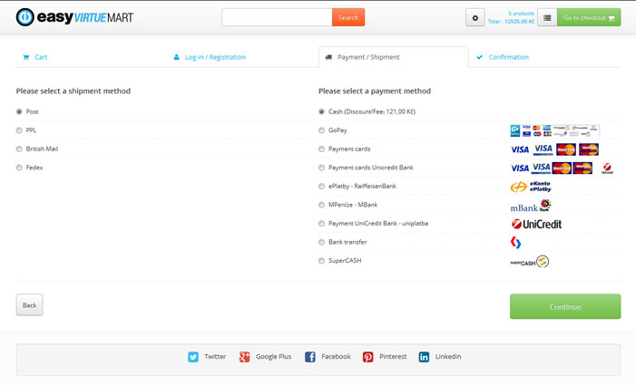 Košík je srdcem každého e-shopu. Desítky implementací VirtueMartu daly vzniknout „Easy“ košíku. Tři intuitivní kroky – registrace/přihlášení, doprava/platba, potvrzení. Na mobilech ještě snadněji. Samozřejmostí je Google e-commerce tracking a napojení na platební brány – například GoPay.