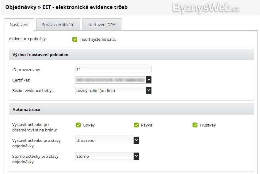 EET certifikát z daňového portálu nahrajete do e-shopu jedním kliknutím.