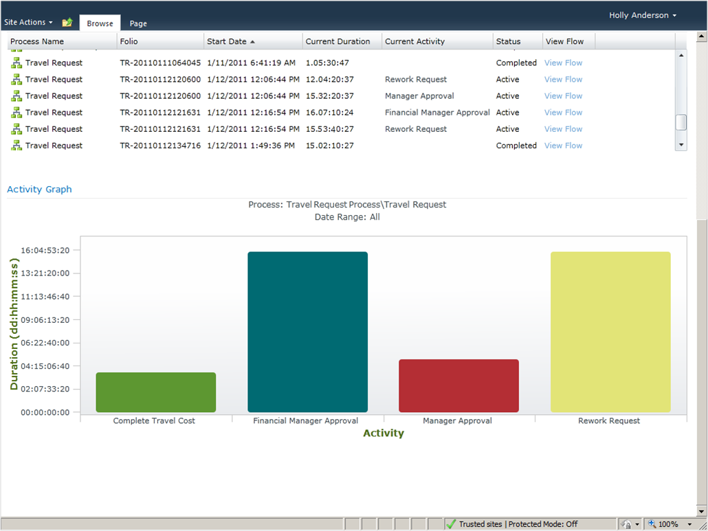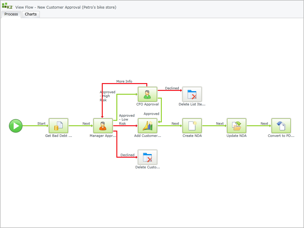 Příkladem jednoduchého procesu může být přijetí, schválení a proplacení faktury. Systém však umožňuje nastavení i podstatně složitějších postupů. Například cyklus schválení smlouvy od dodavatele – od přijetí prvního konceptu asistentkou, přes několikakolové schvalovací a připomínkovací řízení celého managementu společnosti, až po finální schválení ředitele. Celý proces je přitom neustále pod kontrolou. Nástroj K2 View Flow uživatelům poskytuje grafické zobrazení stavu jakéhokoli kroku procesu v reálném čase. U koho se smlouva zdržela, kdo provedl určité úpravy, kdo je další na řadě – vše je okamžitě jasné. Cílem řízení procesů je tak maximálně zjednodušit a zefektivnit chod celé organizace.