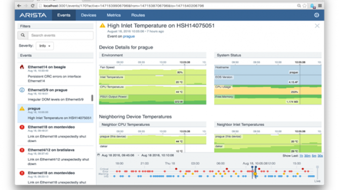 Jak už bylo zmíněno, všechny prvky sítě odesílají změny stavových informací do CloudVision. Jak s daty mohu pracovat? Administrátoři sítě mohou sledovat veškeré dění v reálném čase. Monitorovací dashboard je libovolně modifikovatelný a je možné přidávat parametry, které právě chceme sledovat. Je tak možno v reálném čase v jedné tabulce monitorovat výkonnostní informace jednotlivých zařízení (vytížení procesoru, obsazení paměti atp.), ve druhé tabulce sledovat využití bufferů na portech a v další například počet BGP záznamů v routovacích tabulkách jednotlivých switchů nebo monitorovat parametry optických transceiverů. Jelikož jsou všechny informace uloženy v databázi, je tak zaznamenána kompletní historie všech událostí v síti, a stejně tak historie všech provedených změn. Pomocí rychle dostupné časové osy může administrátor snadno nahlédnout do jakéhokoliv okamžiku v historii a porovnat všechny sledované parametry se současnými. To je užitečné především při řešení a analýze problémů, které v síti nastaly. Všechna data jsou tak zobrazena v souvislostech, a proto jejich analýza velmi rychle odhalí příčiny případného problému.
