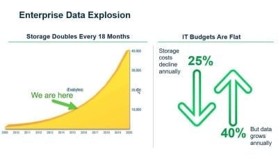O tom, že množství dat neustále narůstá, není třeba polemizovat, to je realita! U každé společnosti je to trochu jiným tempem, avšak u valné většiny platí, že tempo růstu objemu dat je vyšší, než jak klesají ceny datových úložišť. Pro společnosti to tak má jasný důsledek v podobě rostoucích nákladů na uložení dat. Pokud se tomuto chtějí vyhnout, tak je nutné udělat konceptuální změnu v přístupu, jakým tuto problematiku řeší. Tradiční proprietární HW řešení pro ukládání dat totiž není odpovědí na trend rostoucích datových objemů.