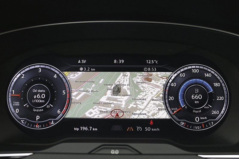 Digitální multifunkční Active Info Display s vysokým rozlišením a úhlopříčkou 12,3“ dokáže graficky zobrazit všechna data o jízdě společně s navigační mapou. Když si řidič například zapne navigaci, otáčkoměr s rychloměrem se zmenší, posunou k okraji a uvolní více prostoru pro mapu navigace. Možností je spousta, každý si může jednoduše nastavit to, co chce právě vidět.