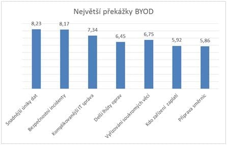 Největší obavy u firemních správců IT vzbuzuje možnost snadnějšího úniku firemních dat (stupeň 8,23 z celkem 10bodové škály) společně s bezpečnostními incidenty (8,17). Velké otazníky mají CIOs také v souvislosti s komplikovanější správou IT (7,34) a servisem. I poměrně běžné úkony, jako je aktualizace a správa softwaru, případně oprava notebooku či tabletu, se mohou stát velkou výzvou pro chod firmy a efektivitu zaměstnance. Otázky typu, zda by v případě poruchy šel do běžného servisu a zaměstnanec ho neměl řadu dní k dispozici, u IT manažerů vzbuzují velkou nejistotu. Delší lhůta oprav je proto považována za další reálné riziko konceptu BYOD (6,45). Všechna rizika, která s sebou BYOD nese, je potřeba řešit předem při jasném nastavení pravidel hry ve firemních směrnicích. Celý proces není silnou stránkou firem soudě podle toho, že přípravu relevantních směrnic považují manažeři podnikového IT spíše za problém (5,86).