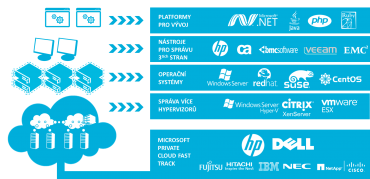 Základním stavebním kamenem privátního cloudu od Microsoftu je Windows Server 2008 R2 Datacenter Edition s technologií Hyper-V. Díky tomu je možné zajistit vysokou dostupnost i vysokou škálovatelnost celého prostředí. Jednotlivé virtuální stroje mohou využívat operační systémy od Microsoftu, ale například i velmi oblíbené distribuce Linuxu, mezi které patří RedHat, SUSE nebo CentOS. Velmi důležitou součástí řešení je sada nástrojů System Center 2012, které celé řešení spravují, a dokonce umožňují začlenění stávající virtualizační infrastruktury postavené na konkurenčních hypervizorech. Jedním z rozdílů privátního cloudu oproti virtualizaci je vysoká míra automatizace, o kterou se stará System Center Orchestrator (dříve Opalis). Díky uvedenému nástroji lze plně automatizovat velkou část úkonů, a dokonce mezi sebou propojit i nástroje od konkurenčních dodavatelů. Důležitý je také prvek samoobslužnosti, který je na cloudu vlastně tím nejzajímavějším, protože umožňuje uživateli získat například nový poštovní server během několika okamžiků pouhým vyplněním webového formuláře. K tomu slouží produkt Systém Center App Controller, který je také součástí řešení.